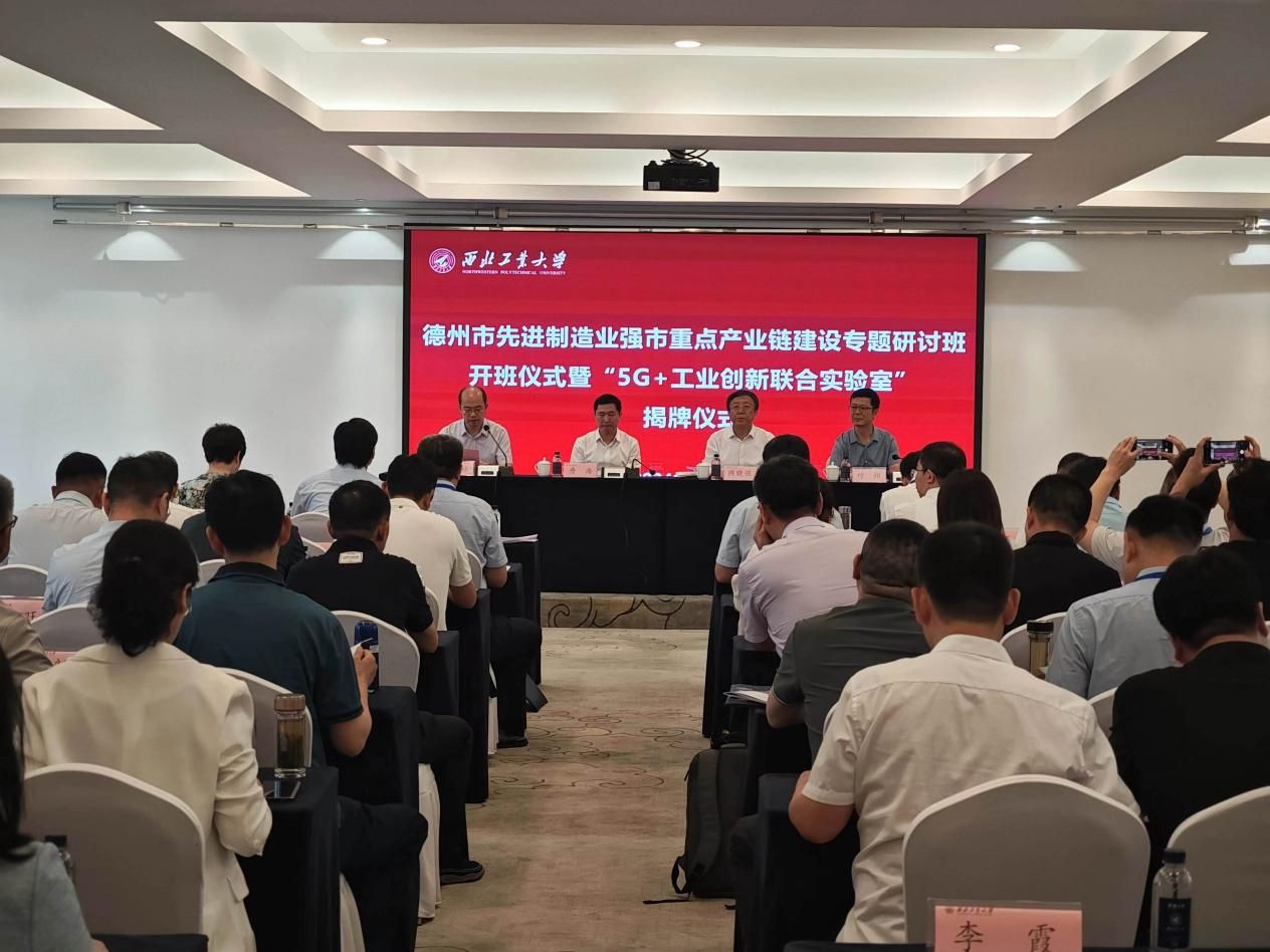 6月28日,山东省德州市人民政府副市长陈晓强、副秘书长谢春田及工信局、发改委科技局、区县主管领导、企业家及山东联通等70余人到我校进行产学研合作对接交流并启动德州市先进制造业强市重点产业链建设专题研讨班。上午8:10,开班仪式暨“5G+工业创新联合实验室”揭牌仪式在我校正禾宾馆西四会议室顺利召开。yl6776永利集团党委副书记、副校长詹浩出席开班仪式并致辞。会议由继续教育学院院长李春林主持,山东联通科技创新部总经理付翔、6776永利集团副院长罗明及材料学院、无人系统战略发展中心相关教师参加会议。