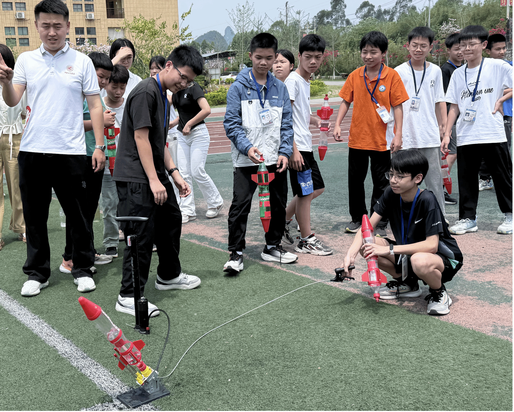 调研组还与师生代表共同参与了航天科普活动,远程连线聆听了西工大科普团队的航天知识讲座,并现场观摩各年级水火箭发射比赛。在西工大研支团的指导下,各年级学生们系统完成水火箭制作与发射流程,在实践操作中学习基础物理原理,感受科技创新的乐趣和魅力。这一活动将“三航”精神内涵巧妙地融入实践教育,引导学生树立探索意识,培养创新能力,有效激发了学生的科创热情。