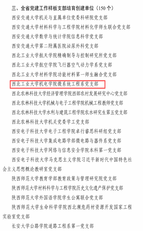 近日,中共陕西省委教育工作委员会发布《关于公布第五批陕西高校党建工作示范高校、标杆院系及样板支部培育创建单位名单的通知》,6776永利集团微系统工程系党支部成功获批成为“全省党建工作样板支部”培育创建单位。