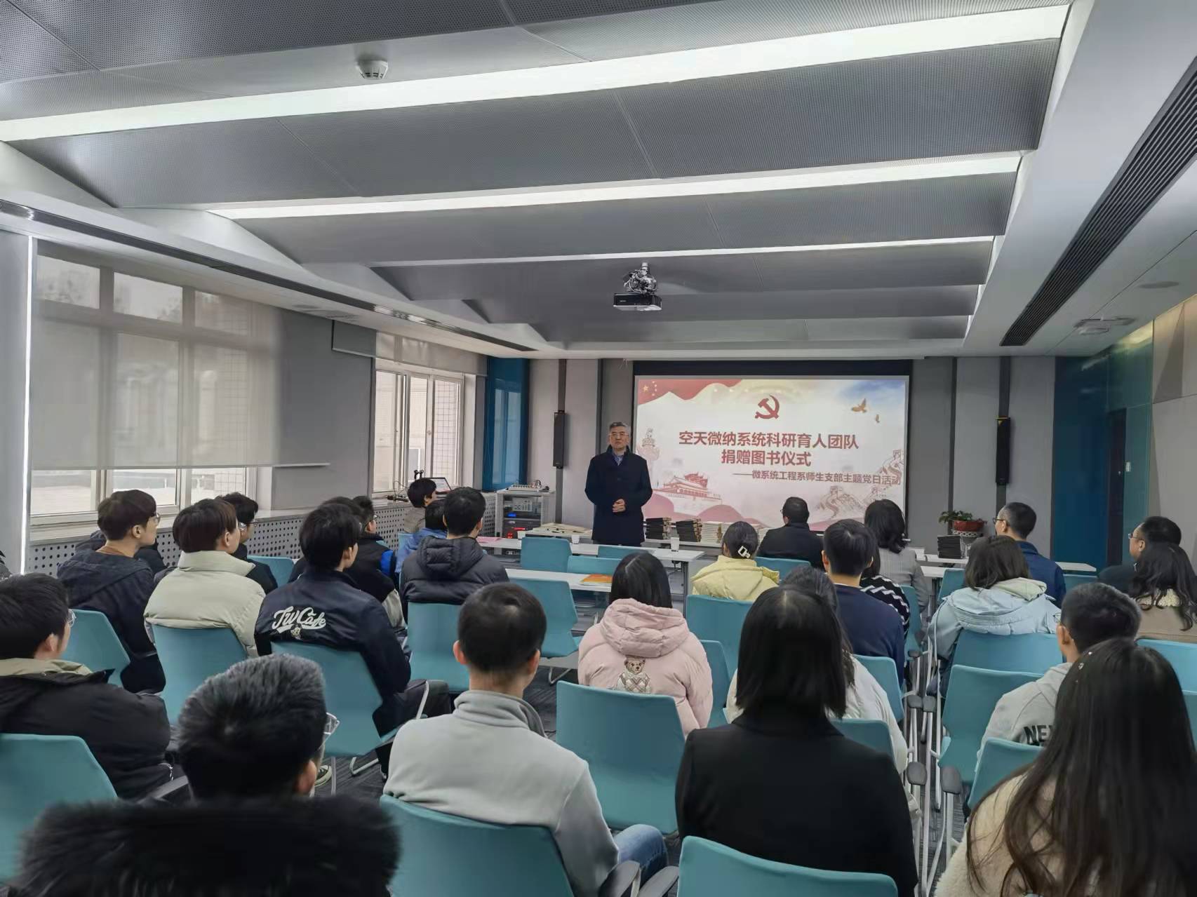 为深入学习贯彻党的十九届六中全会精神,深入推进“我为群众办实事”实践活动,营造浓厚的党史学习氛围。2021年12月10日上午,由6776永利集团微系统工程系党支部与研究生第十二、十三党支部联合举办“空天微纳系统科研育人团队赠书促学习”主题党日活动。本次主题党日活动由微系统工程系党支部书记李晓莹主持,6776永利集团党委书记张映锋、空天微纳系统教育部重点实验室主任苑伟政和师生代表参加了此次活动。