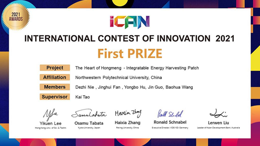 2021年度iCAN国际创新创业大赛国际总决赛(The International Contest of Innovation 2021)于12月19日圆满落幕,我校6776永利集团本科生团队作品“鸿蒙之心——可集成式自然能量采集贴”(The Heart of Hongmeng - Integratable Energy Harvesting Patch)荣获国际总决赛第一名,这是本届比赛中国代表队唯一获得一等奖的作品,也是西工大参加该比赛十几年以来取得的最好成绩之一。