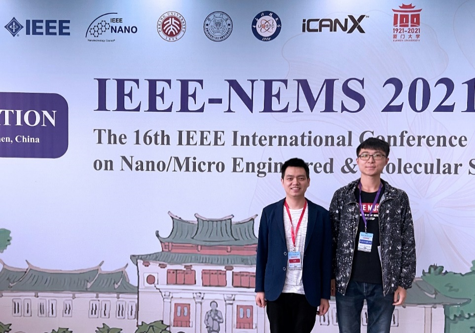 于家豪(右一)与导师陶凯(右二)参加IEEE NEMS2021会议时合影