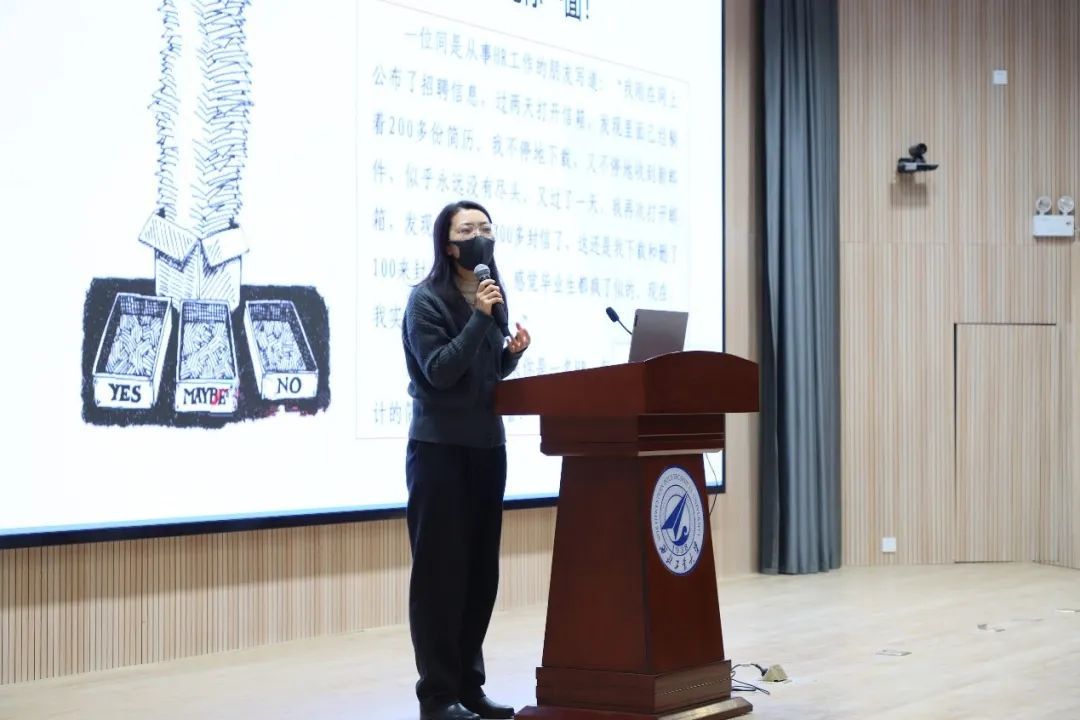 刘伟老师为大家分析了当前的就业形势,指出当前就业环境艰难,鼓励同学们关注招聘会的举办场次和时间分布,充分了解就业市场情况,理性调整就业心态,积极提升就业竞争力。刘伟老师还为同学们介绍了我校招聘信息获取渠道以及其他的一些头部招聘网站。