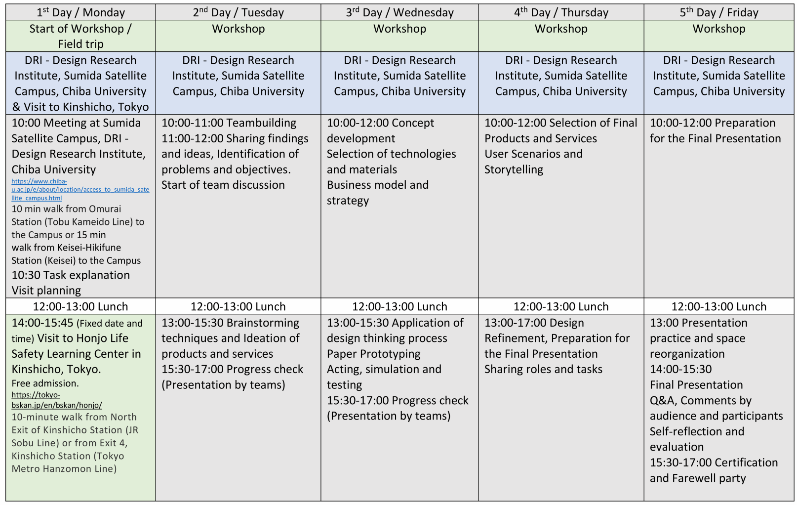 2 | 星期一 | 上午:大学说明会、分组 下午:分组设计/Workshop | 7 | 星期六 | 全天:自由研修 |