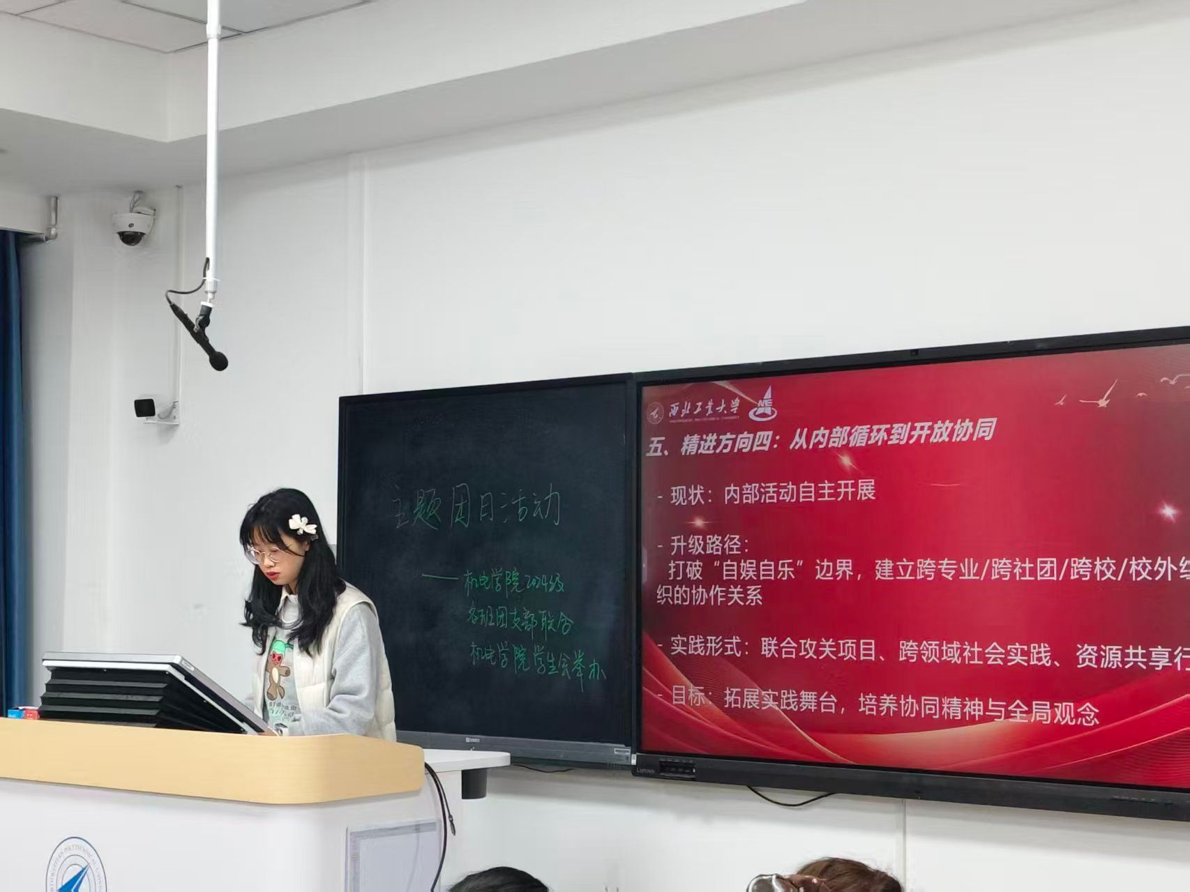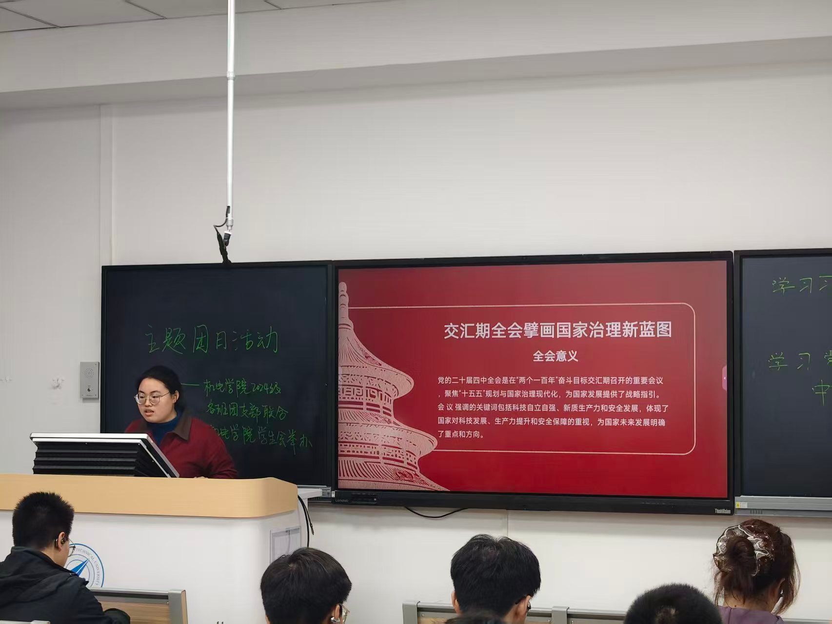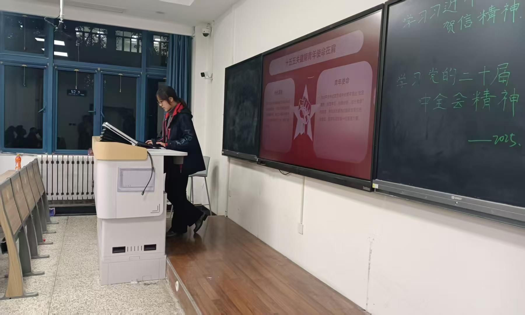 紧接着,办公室负责人胡玮琦同学结合党的二十届四中全会精神,深入剖析了全会的重大历史意义与现实价值。她以青年视角为出发点,着重强调了青年责任担当与文化传承创新的重要性,并借助五维雷达图这一直观形式,清晰解读了 “十五五” 规划的主要目标,帮助同学们明确了未来的奋斗方向。