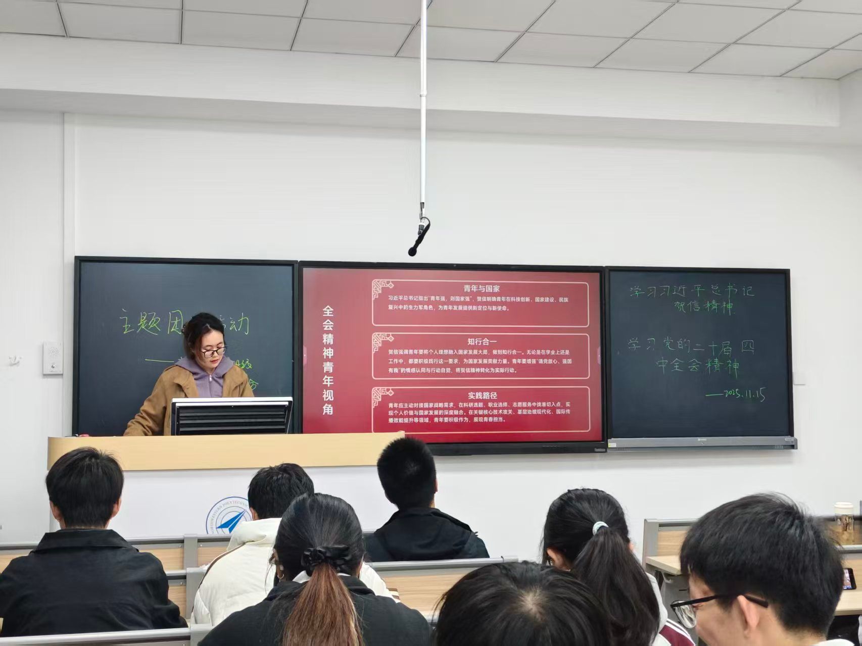 随后,陆晏同学聚焦习近平总书记贺信精神展开深度解读,从青年视角切入,围绕 “青年与国家” 的紧密关联、“知行合一” 的实践准则以及青年成长的 “实践路径” 等核心内容进行细致阐释,进一步深化了同学们对 “四个认同” 的理解与体悟,引导大家将个人理想融入国家发展大局。