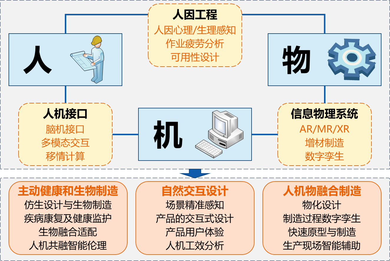 主动健康和生物制造方向以人为研究对象,通过3D打印直接制造人工器官,通过外骨骼增强人力,通过脑机接口实现人机直接感知与控制。本方向将对疾病康复训练、老龄化科技应对方面提供新技术和手段,同时它将为三个研究方向的人机共融智能的生理、心理和伦理问题提供评价和分析,是相关研究方向正确发展的保证。