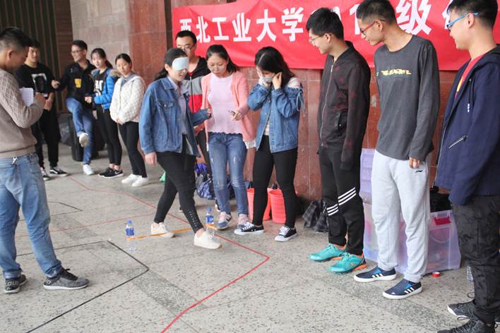 第二个游戏是身不由己。地面上有用彩带铺设的形状不规则的狭小通道,而且路线中间设有路障,蒙着眼罩的同学需要在另一队员的言语指导下完成跨障碍行走。轨道尽头由另外两名队员完成接力,沿着相反方向回到起点。这个游戏很考验队友之间的信任和默契,大家在完成这个小游戏之后都兴致高昂,进一步增进了彼此间的了解。