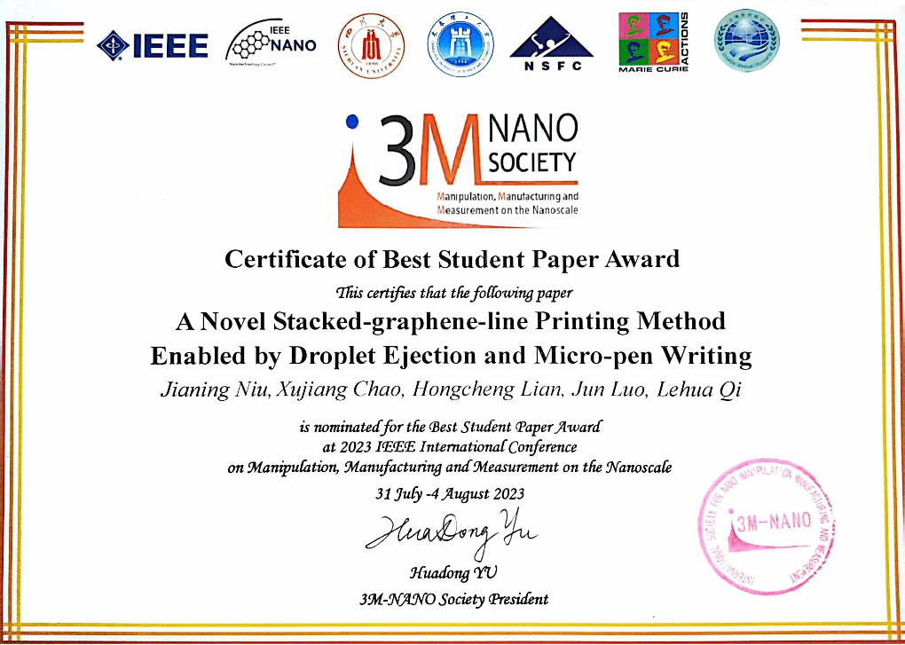 针对以上问题,6776永利集团齐乐华教授团队提出一种联合均匀微滴喷射和微笔直写打印的多叠层石墨烯图案制备新方法,并成功地打印出含有多叠层石墨烯的微结构图案。该工作为具有空间结构的石墨烯图案打印提供了一种新颖方法。相关成果以题为“A novel stacked-graphene-line printing method enabled by droplet ejection and micro-pen writing”被IEEE 3M-NANO 2023国际会议录用并荣获“Best Student Paper Awards”。论文第一作者是团队在读研究生牛佳宁博士,通讯作者是晁许江副教授。本届会议共有三篇论文获奖,获奖率约为1%。该研究工作受到国家自然科学基金重点项目、深圳市自然科学基金基础研究面上项目和中国博士后科学基金支持。