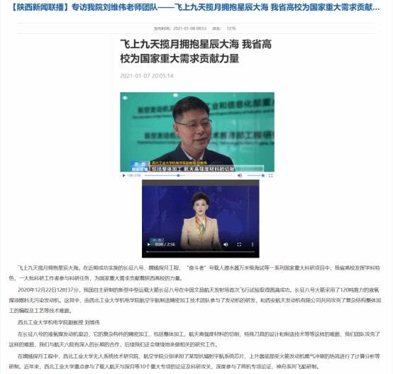 5.4.5【陕西新闻联播】专访我院刘维伟老师团队——飞上九天揽月拥抱星辰大海 我省高校为国家重大需求贡献力量